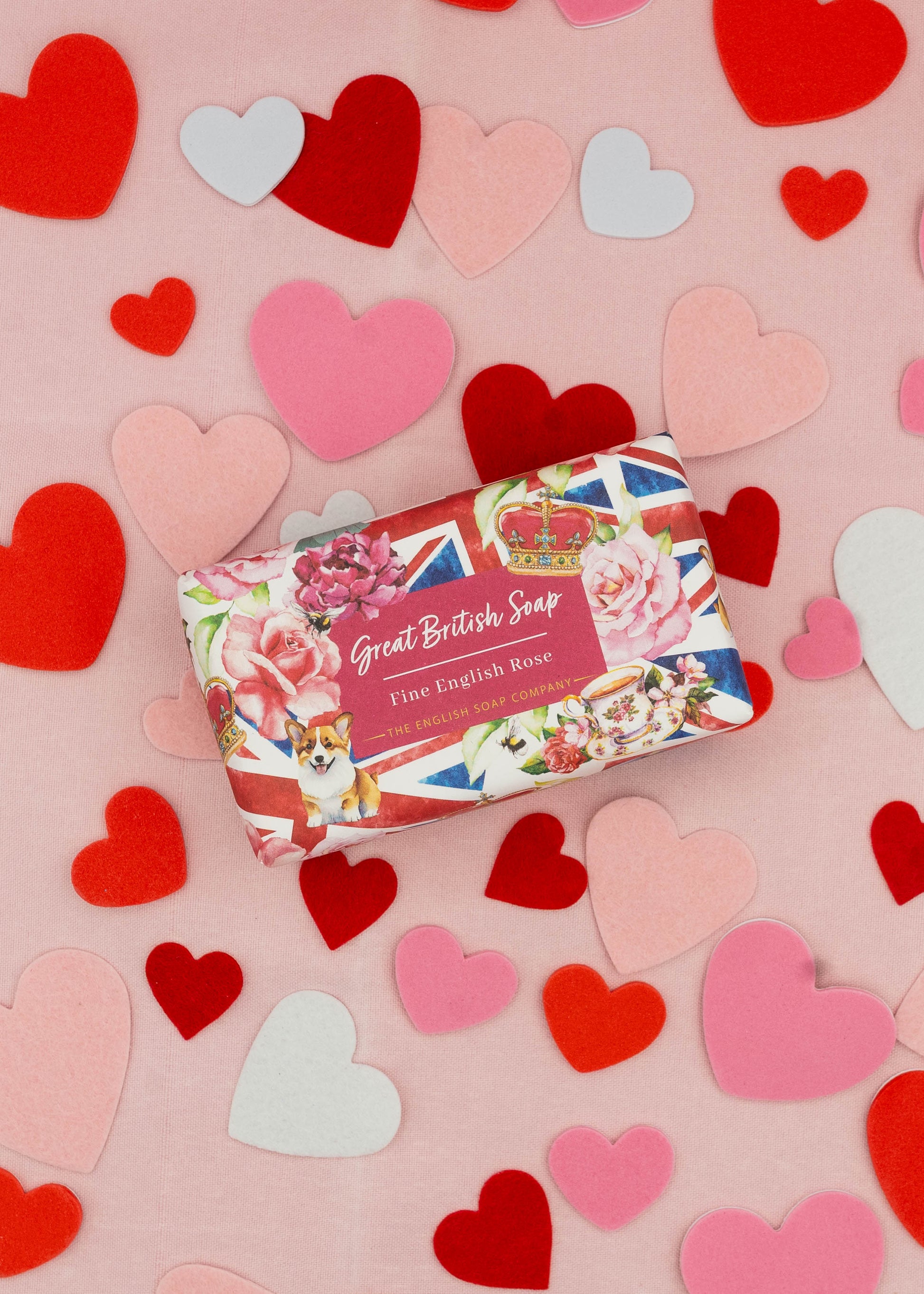 Celebrate British culture with a luxurious soap bar wrapped in whimsical packaging that pays homage to our nation’s traditions. The paper wrap is decorated with elegant English roses, busy bees, regal crowns, Queen Elizabeth II beloved pet Corgis and would it even be English without a nice cup of tea?