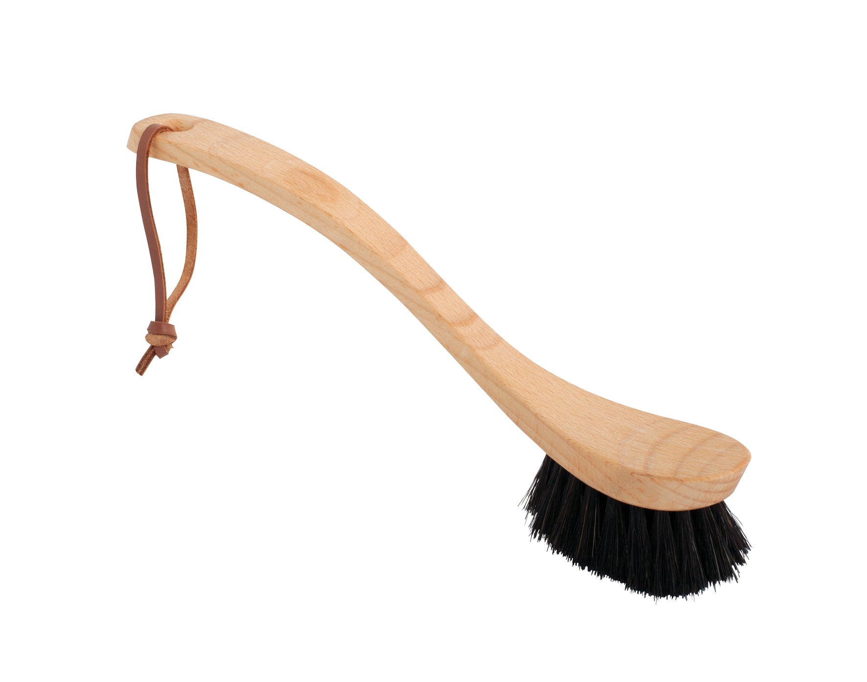 Beautifully crafted from oiled beechwood set with black horsehair, our curved dish brushes are elegantly shaped and a joy to use whether you choose softer dark horsehair or tougher tampico or union fibre options. Finished with a leather hanging loop to suspend from a hook after use, it measures 23.5cm long.