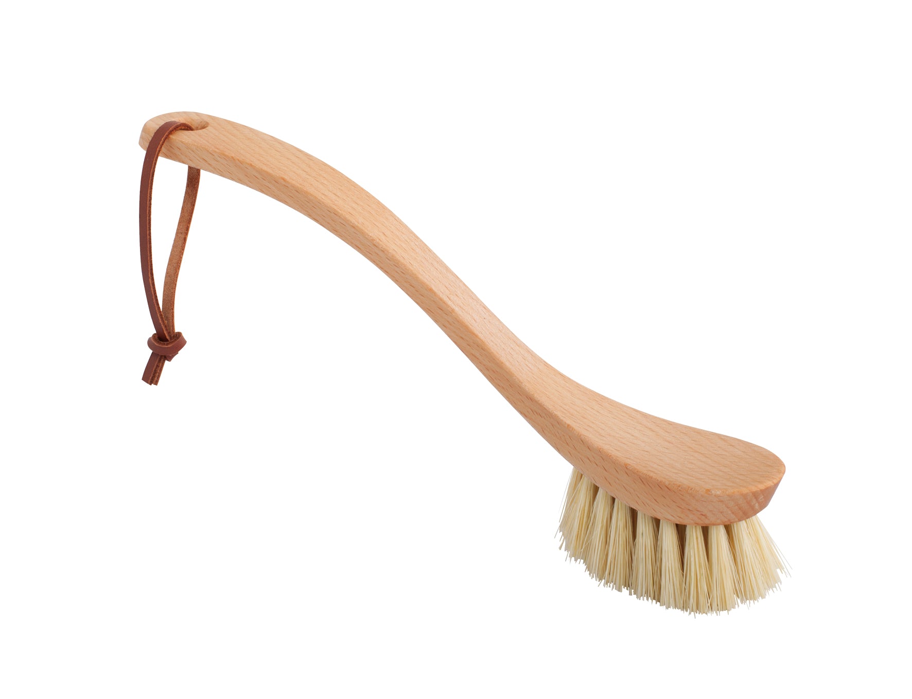 Beautifully crafted from oiled beechwood set with tough tampico fibre, our curved dish brushes are elegantly shaped and a joy to use whether you choose tough tampico fibre, softer dark horsehair or extra tough union fibre options. Finished with a leather hanging loop to suspend from a hook after use, it measures 23.5cm long.
