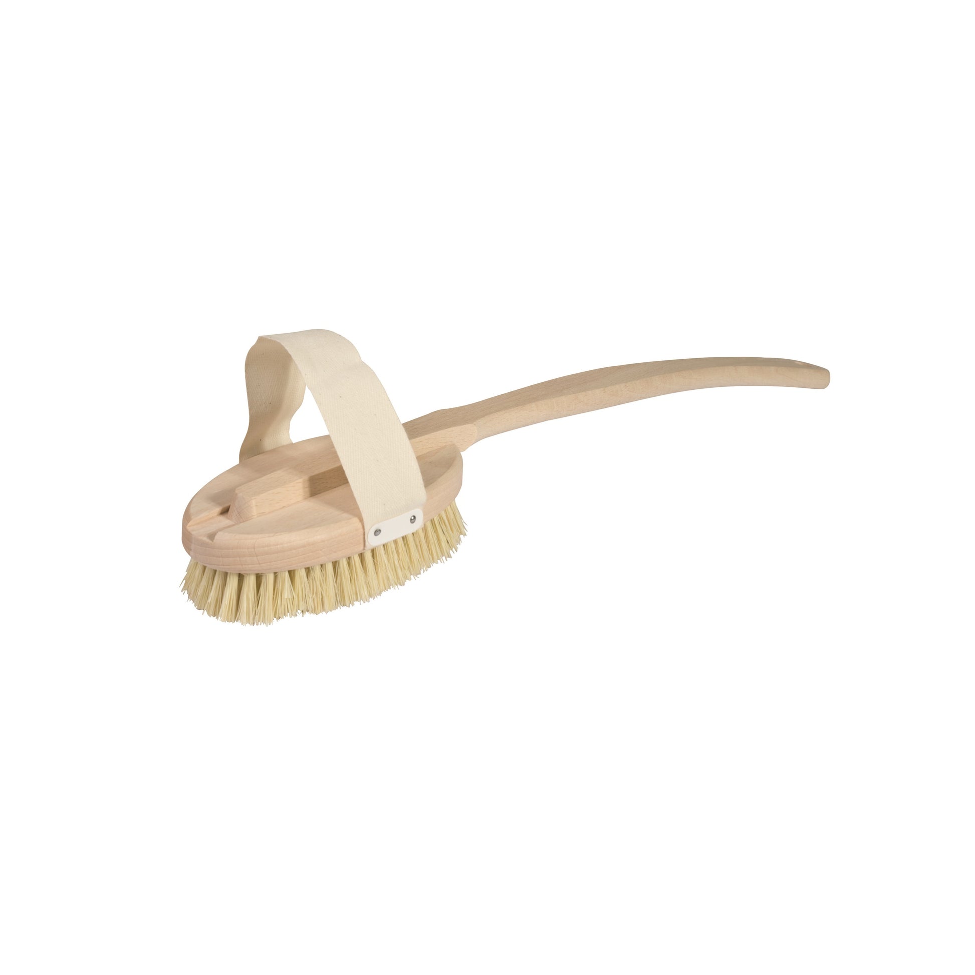 An untreated beechwood bath brush a long, gentle curved handle fitted with a removable, stiff, tampico brush head with cotton strap for ease of use when removed from the handle. Finished with a cotton loop for hanging up to dry after use, it measures 47cm long and is an excellent, simply designed bath or shower brush which will serve for years of faithful use. Also available with soft, light bristle brush head, code 631050.