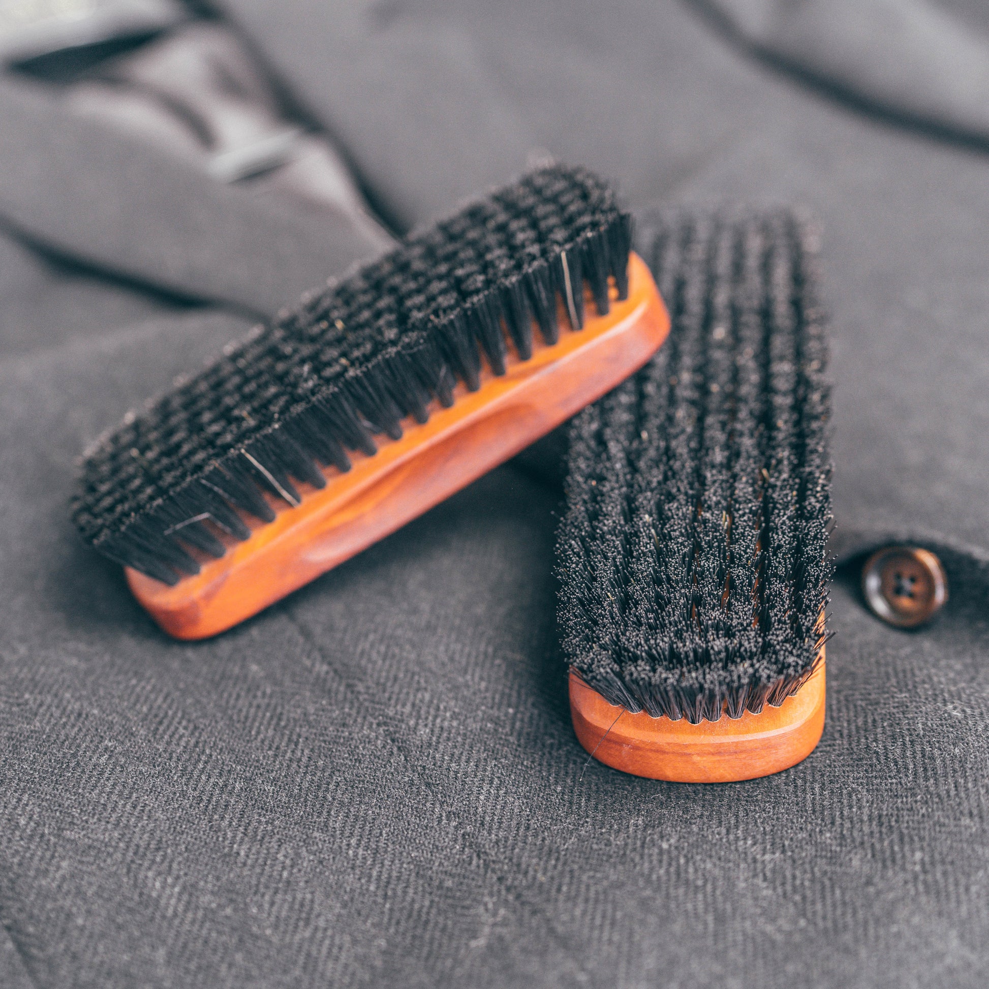 A useful, everyday, small clothes brush hand crafted from oiled beechwood set with stiff, black bristle. With indentations on each side of the full length handle for comfortable use, its tough, bristles will brush dust and dirt from clothing with ease. 13.5cm long,