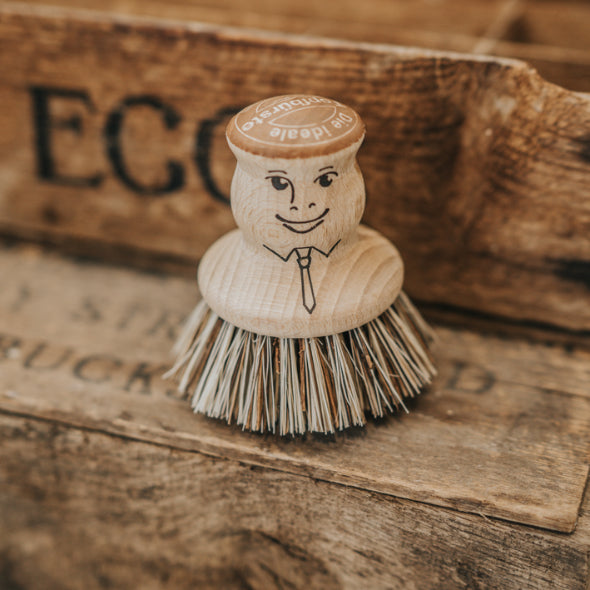 This dinky little chap will be a valued assistant in the shed, at the kitchen sink, in the boot room or in the laundry as his tough, union fibre bristles will make light work of any particularly fiddly cleaning job. Made from untreated beechwood and painted with a quirky face plus collar and tie, his painted top resembles a flat cap or beret. 6.5cm diameter.