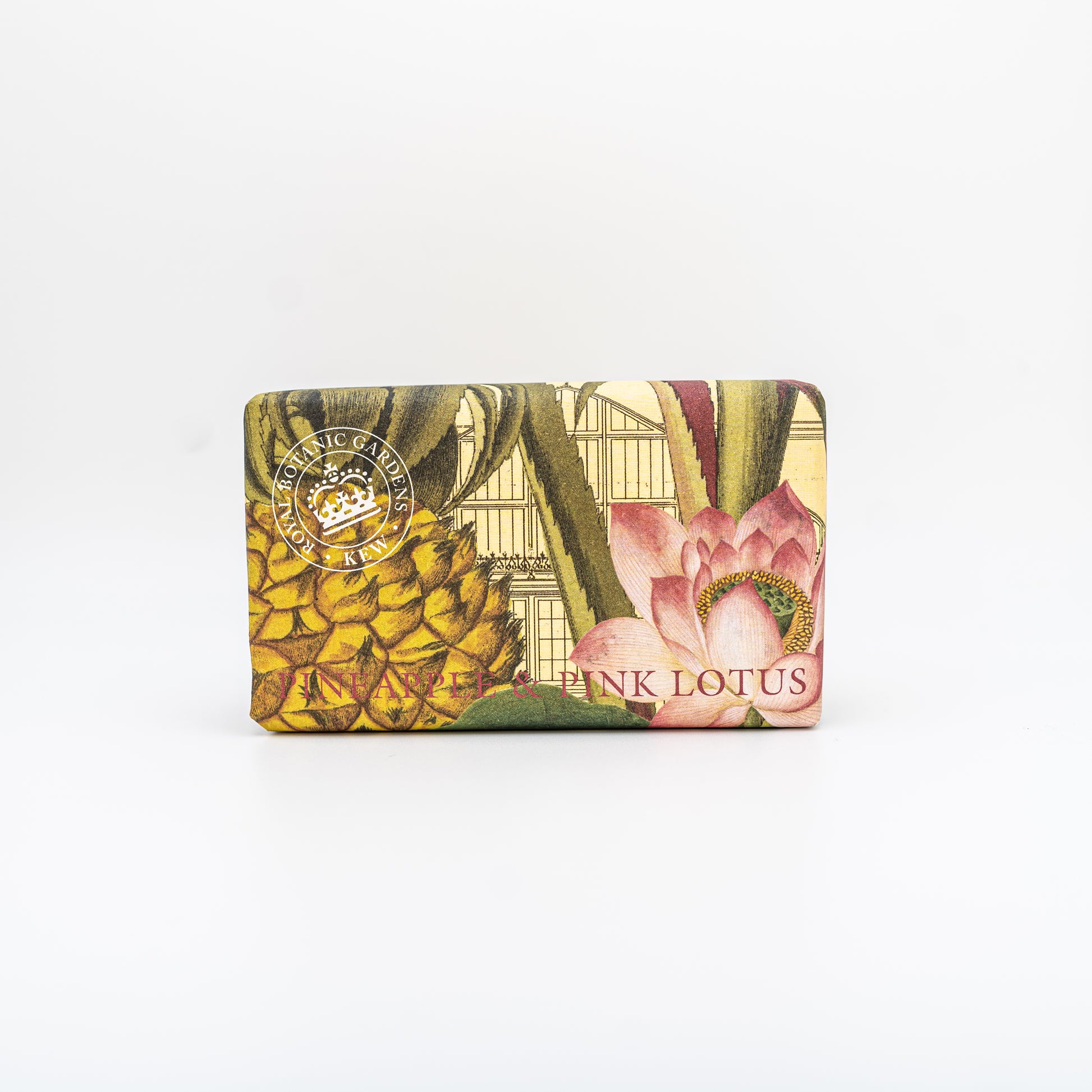 Pineapple and Pink Lotus scented luxury soap bar, from the Kew Gardens soap collection. This moisturising shea butter soap has a fragrance bursting with sweet fruity notes of pear, pineapple, cassis, peach, raspberry, plum and cherry almond. A strong floral background of pink lotus creates a perfect balance between sweet and blossom. The paper wraps are printed with beautiful illustrations selected from Kew Garden’s historic archives to give the product its unique design.