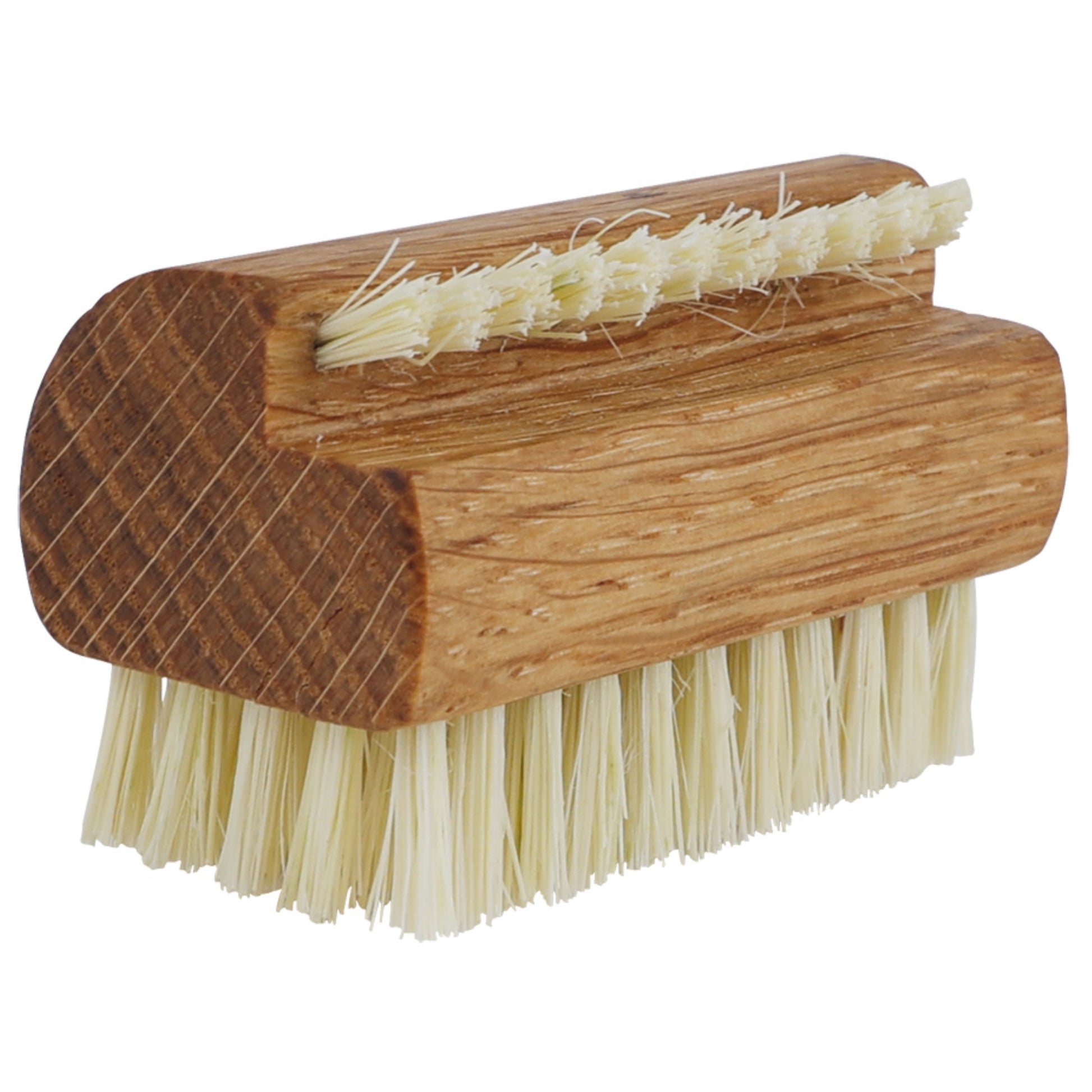An oiled oak pocket size travel nail brush inset with an upper row of extra stiff, tampico fibre, for effective scrubbing of fingernails, plus a broader base flat section of medium firm bristle for general nail and hand scrubbing. With its comfortable curved shape, this brush is easy to use, and at 5.5cm long x 3cm wide it is perfect for travel and smaller sized wash basins.