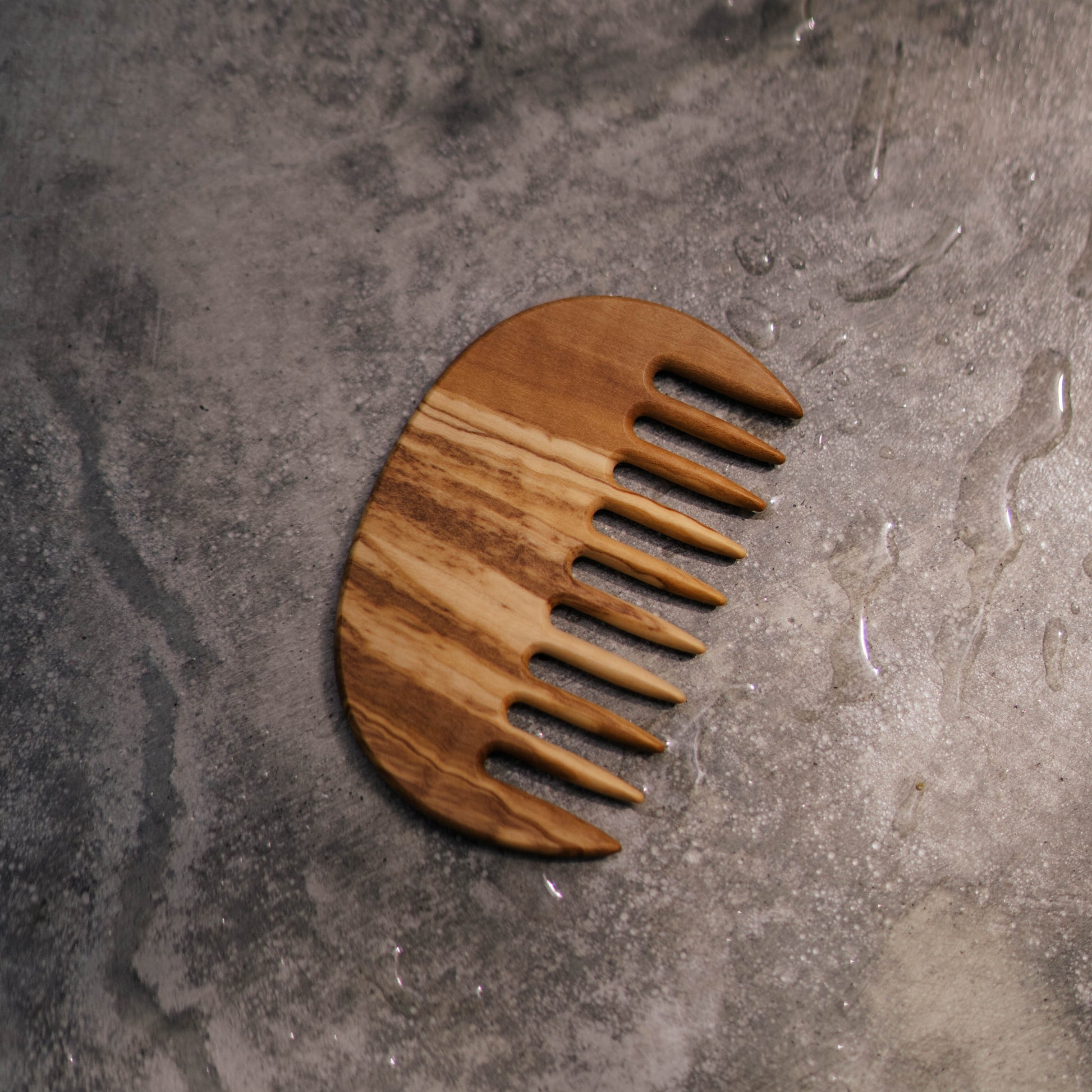 Hand crafted from beautiful, natural olive wood which wears its unique markings with pride, our oiled olive wood afro hair styling comb has a gently curved, integral handle for comfortable use and extra wide spaced, evenly sized wide comb 'teeth' to manage thicker, longer and afro hair. 10.5cm wide.