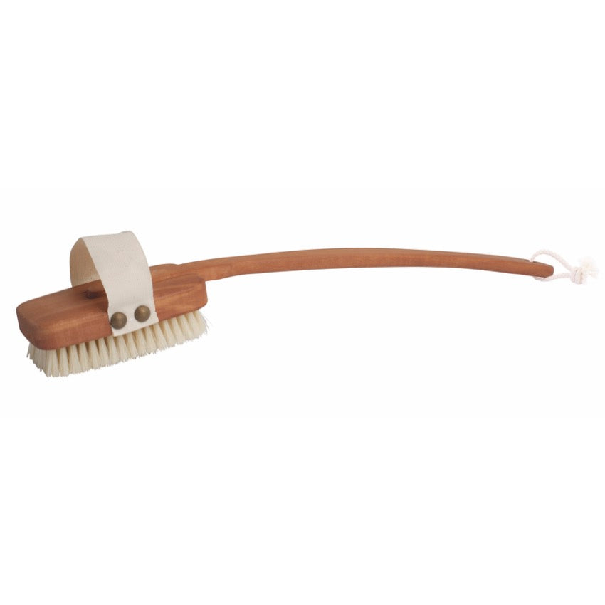 With a removable, rectangular brush head with cotton belt set on a long, curved handle, this elegant, oiled pearwood and light bristle bath brush combines contemporary design and fine craftsmanship with functionality. 43cm long overall, it is finished with a cotton loop for hanging up to dry after use.