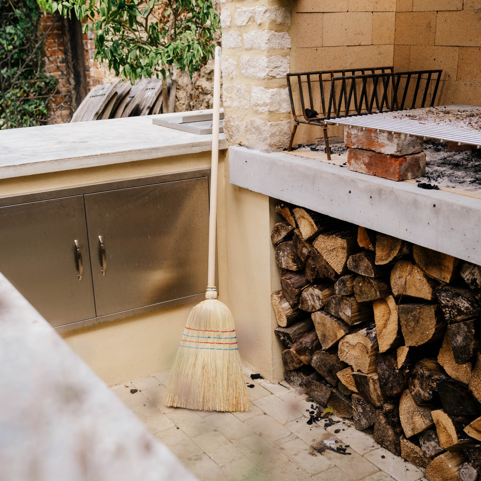 A traditional, broad sweeping broom crafted from rice straw, or sorghum which is harvested in the Balkans. Extremely good for sweeping leaves and straw as the rice straw fibres do not absorb water, this outdoor broom is made with an untreated wooden handle and has four rows of stitching to secure the straw in place. Perfect for garden use, stable use, on the patio and in the kitchen. 135cm long.