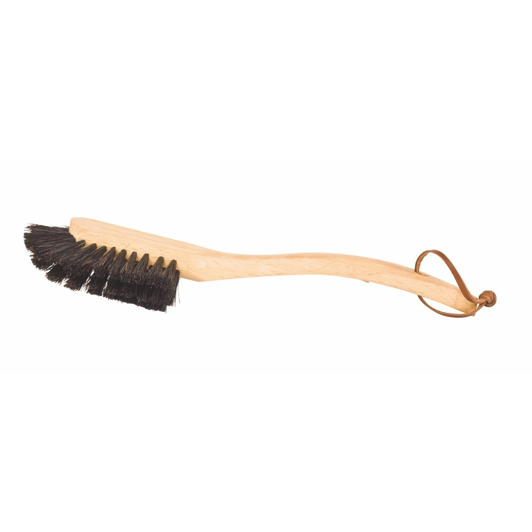 Able to reach into all corners and crannies thanks to the brush head being set with black horsehair on all sides and to the front in an effective splayed design, our oiled beechwood, curved handle dish brush will make light work of the washing up and is finished with a leather loop for hanging after use. Also available in tampico fibre. 26.5cm long, it is also available with tough tampico fibre.